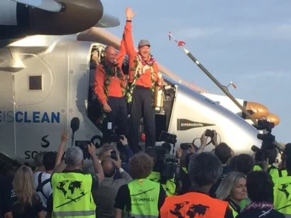 Celebrating their non-stop solar powered flight from Japan to Kalaeloa